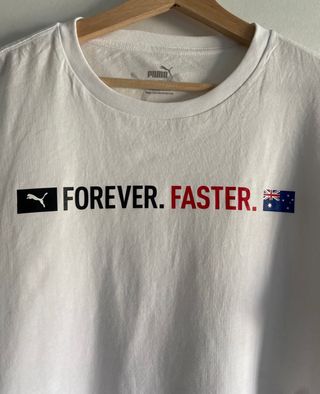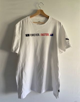 Camiseta blanca de la marca Puma con el lema Forever Faster. - Diseño frontal con el logo de Puma y el texto Forever. Faster.. - Detalle de la bandera australiana junto al texto. - Logo de Puma en la manga derecha.