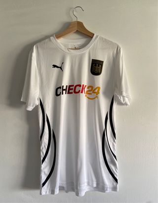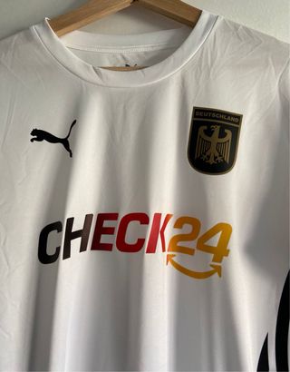 Camiseta de la Selección de Alemania con el patrocinador CHECK24. - Diseño blanco con detalles en negro. - Escudo de Alemania en el pecho. - Logo de Puma.