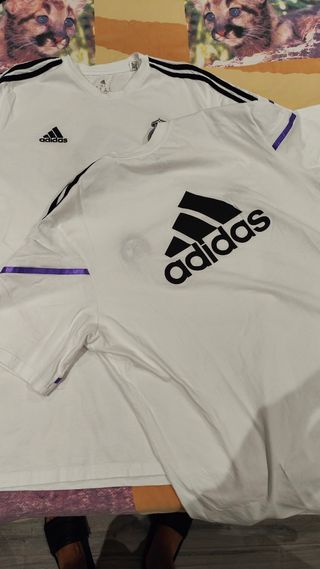 Trabajo para el Real Madrid, puedo adjuntar prueba, ropa en desuso. En perfecto estado incluso nueva. Dos camisetas de algodón del Real Madrid, de la marca Adidas. Están en buen estado. - Talla: XL - Diseño: Logo Adidas y escudo del Real Madrid - Tejido: Algodón