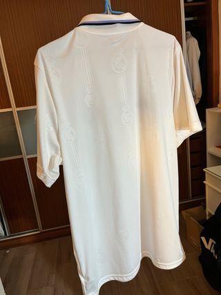 Camiseta de fútbol del Real Madrid de la temporada 2001. - Diseño clásico en color blanco. - Logo de Adidas bordado. - Escudo del Real Madrid. - Parche LFP en la manga. - Detalle conmemorativo en la otra manga.