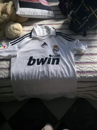 Camiseta de fútbol del Real Madrid de la temporada 2009. - Diseño clásico con detalles en negro y dorado. - Logo de Adidas y escudo del Real Madrid bordados. - Parche de la LFP en la manga.