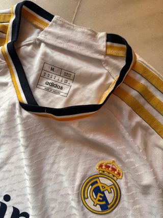 Equipación oficial del Real Madrid. - Camiseta blanca con detalles negros. - Logo de Adidas y patrocinador Emirates Fly Better. - Escudo del Real Madrid. - Parche de la Champions League. Comprada en el Santiago Bernabeu y solo la usé para ver el partido. Player Version