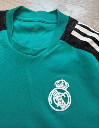 Camiseta de fútbol del Real Madrid. - Diseño deportivo. - Detalles de rayas en los laterales. - Escudo del club y logo de la marca. - Patrocinador Emirates Fly Better en el frontal. Salvo ciertos detalles en el cuello, en buen estado