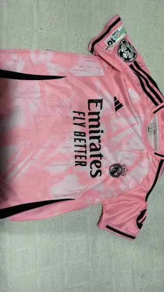 Camiseta de fútbol del Real Madrid en color rosa. - Diseño con detalles gráficos. - Logo de Adidas en la manga. - Escudo del Real Madrid bordado en el pecho. - Sponsor Emirates Fly Better en el frontal.