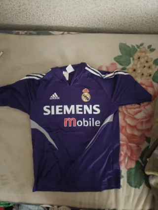 Camiseta de fútbol del Real Madrid. - Diseño con cuello redondo y mangas cortas. - Detalles de las tres rayas de Adidas en los hombros. - Escudo del Real Madrid y logo de Siemens Mobile en el frontal.