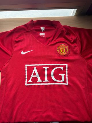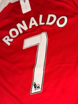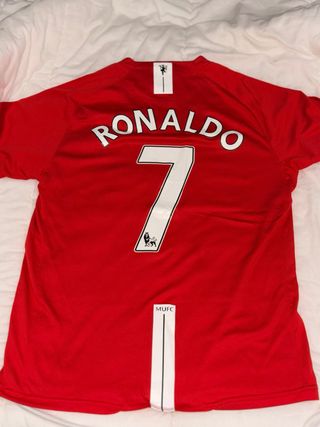 Camiseta de fútbol del Manchester United de la temporada 2008, con el dorsal y nombre de Cristiano Ronaldo y parches de premier league. Talla L