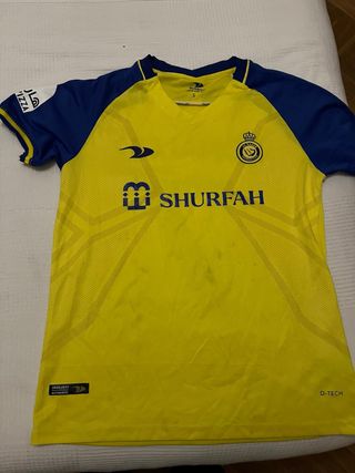 Camiseta de fútbol del Al Nassr, talla S. Diseño deportivo con detalles llamativos. - Mangas de color azul. - Escudo del club en el pecho. - Logotipo de patrocinador en la parte frontal. - Detalle de temporada 2022-2023.