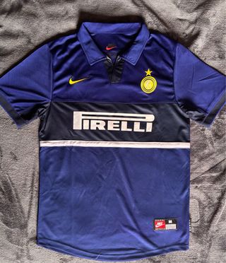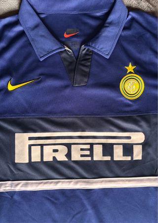 Camiseta de fútbol del Inter de Milán, modelo de la época de Ronaldo. - Diseño clásico con detalles en azul y negro. - Logo de Pirelli en el frontal. - Escudo del club y estrella bordados. - Cuello tipo polo con cierre de botones.