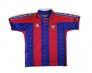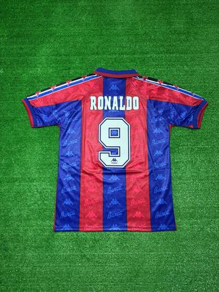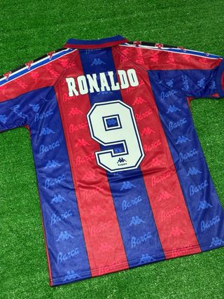Camiseta original de fútbol correspondiente a la equipación local del barça en la temporada 1996 1997 del delantero brasileño Ronaldo, el dorsal es sublimado en la propia tela, complicada de encontrar así Sponsor Kappa Talla M oversized Perfecto estado