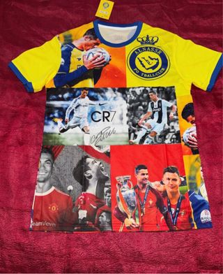 Camiseta con estampado de Cristiano Ronaldo y el equipo Al Nassr. - Diseño con varias imágenes del jugador. - Incluye el escudo del Al Nassr FC.