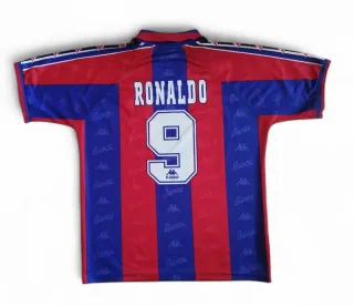 Camiseta de fútbol vintage del FC Barcelona. - Diseño a rayas rojas y azules. - Nombre y número de Ronaldo estampados. - Logo de Kappa en la manga y cuello.