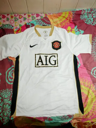 Camiseta de fútbol retro del Manchester United, temporada 2007. - Diseño clásico con detalles dorados. - Escudo del club bordado. - Logo de Nike. - Patrocinador AIG.