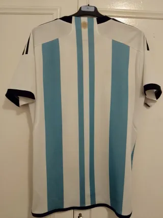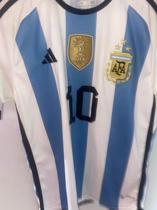Camiseta de la selección argentina de fútbol, original modelo del Mundial 2022. - Diseño con franjas celestes y blancas. - Detalles de Adidas y FIFA World Cup 2022. - Escudo de la AFA con tres estrellas.