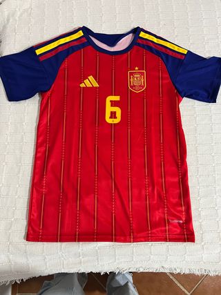 Camiseta de fútbol estilo Selección Española. - Diseño a rayas verticales rojas y amarillas. - Mangas y cuello en azul. - Escudo de la selección en el pecho. - Número 6 en grande en la parte frontal. - Tejido transpirable - Envío rápido y seguro