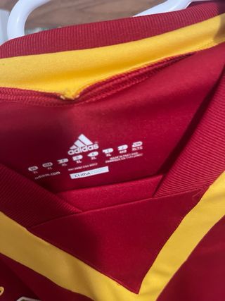 Camiseta de la selección española en talla M. - Diseño con franjas verticales rojas y detalles amarillos. - Mangas y cuello en azul marino. - Escudo de la selección bordado en el pecho. - Logo de Adidas en amarillo.