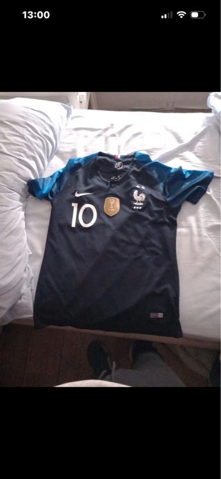 Camiseta de la selección francesa de fútbol, usada en el Mundial de 2018. - Diseño con el número 10 en blanco. - Escudo de la selección francesa. - Logo de Nike. - Parche de campeón del mundo.