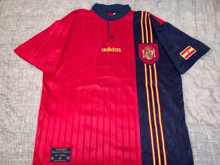 Camiseta de fútbol de la Selección Española de la Eurocopa de Inglaterra de 1996.En muy buen estado y original 100% de la época. - Diseño con paneles en rojo y azul marino. - Logo de Adidas en amarillo. - Escudo de la selección española. - Detalles de rayas en las mangas. - Antigua,retro,vintage...