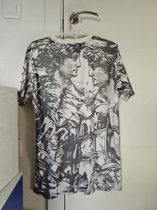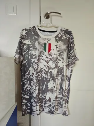 Camiseta no oficial de la selección italiana con diseño único. - Estampado artístico con figuras y arquitectura. - Detalle de la bandera italiana en el pecho. - Nueva sin estrenar