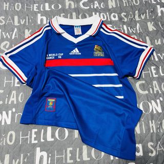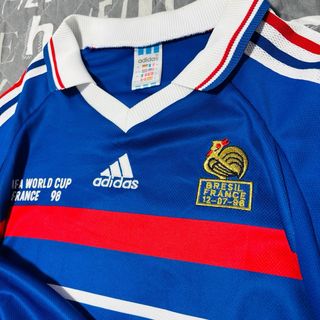 Camiseta de la selección francesa de fútbol, utilizada en el Mundial de 1998. - Diseño clásico con los colores de la bandera francesa. - Logo de Adidas y escudo de la selección bordados. - Detalle de las tres franjas de Adidas en las mangas.