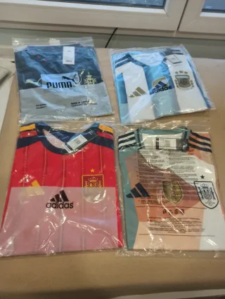 Conjunto de cuatro camisetas de fútbol de selecciones. - Camiseta negra con detalles Puma. Portugal 2025/26 Mundial - Camiseta azul y blanca con detalles Adidas.1° Argentina 2025/26 Mundial - Camiseta roja con escudo. 1° España 2025/26 Mundial - Camiseta multicolor con escudo. 1° España Femenino 2025/26 Precio individual:20€ 2 Camisetas: 37€ 3 Camisetas:54€ 4 camisetas: 65€