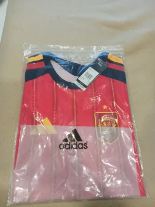 Camiseta de la selección española de fútbol. - Diseño con franjas verticales rojas y detalles en azul marino y amarillo. - Escudo de España bordado en el pecho. - Logo de Adidas en amarillo.