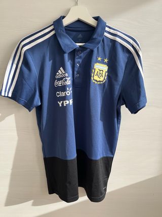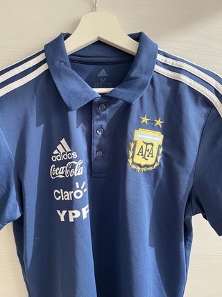 Polo oficial de la Selección Argentina de fútbol, marca Adidas. - Diseño con las icónicas tres rayas de Adidas en las mangas. - Escudo de la AFA y logo de Adidas en el pecho. - Detalles de patrocinadores en la parte frontal.