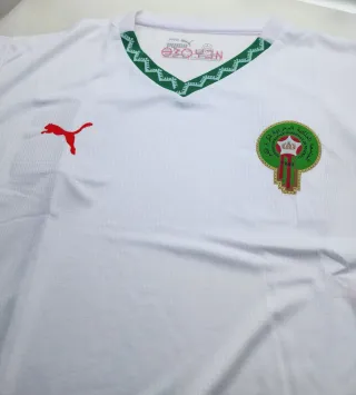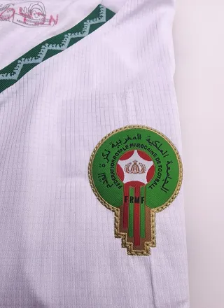 Camiseta de la selección de Marruecos con el escudo bordado. - Diseño con detalles verdes y blancos. - Escudo de la Federación Real Marroquí de Fútbol (FRMF).