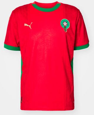 Camiseta de la selección de Marruecos. - Diseño con cuello redondo y mangas cortas. - Detalles en verde en cuello y mangas. - Escudo de la selección y logo de la marca. - Tejido con patrón texturizado.