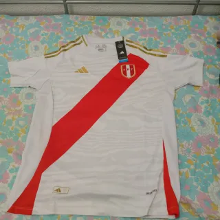 Camiseta deportiva de la selección de Perú, nueva y con etiquetas. - Diseño con franja roja diagonal. - Detalles dorados en hombros y logo. - Tecnología Aeroready para mayor transpirabilidad.