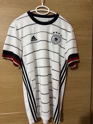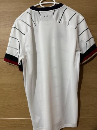 Camiseta de fútbol de la selección alemana. - Diseño a rayas horizontales. - Detalles en negro y rojo en cuello y mangas. - Logo de Adidas y escudo de la selección.