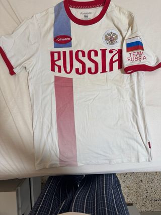 Camiseta oficial de la selección de fútbol de Rusia, modelo 2015. - Diseño con el escudo de Rusia y el logo de FORWARD. - Inscripción RUSSIA en grande en la parte frontal.