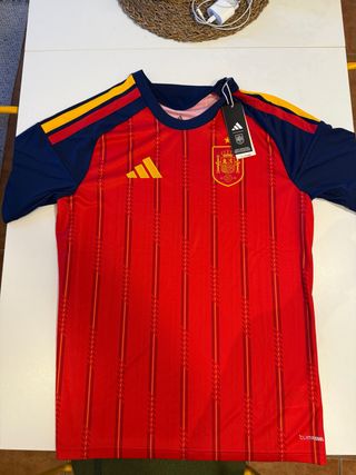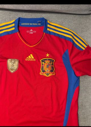 Camiseta de la selección española de fútbol. - Diseño con detalles en amarillo. - Logo de Adidas y escudo de la selección. - Parche de campeón del mundo FIFA.