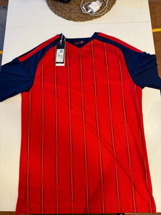 Camiseta oficial de la Selección Española de fútbol. - Diseño bicolor en rojo y azul marino. - Logo de Adidas en amarillo. - Escudo de la RFEF en el pecho. - Cuello con botones.