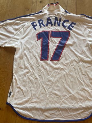Camiseta oficial de la selección francesa de fútbol de Adidas, modelo de 2001. - Diseño clásico en blanco con detalles tricolores. - Escudo de la FFF bordado. - Inscripción Espagne France Presse 28 Mars 2001 en el pecho.