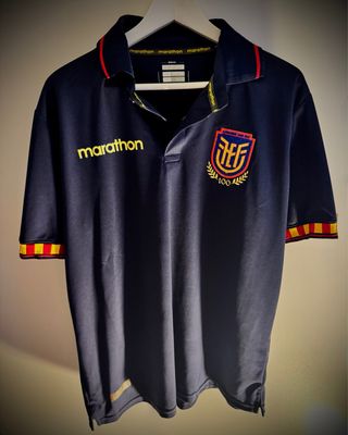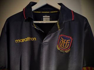 Camiseta de la Selección de Ecuador conmemorativa del centenario. - Diseño con el escudo de la selección. - Detalles de Marathon en la prenda. - Ribetes en cuello y mangas con los colores de Ecuador.