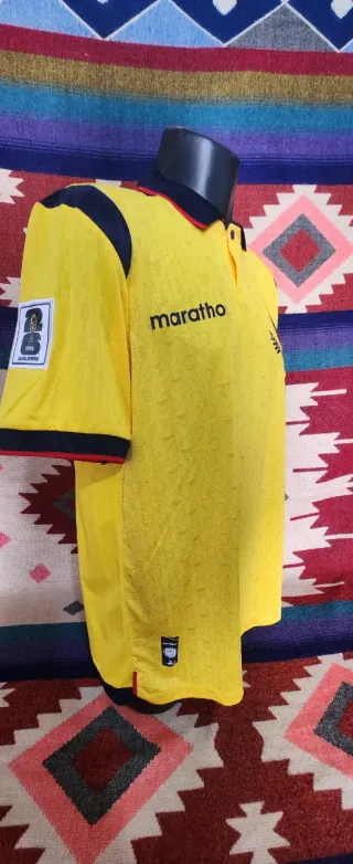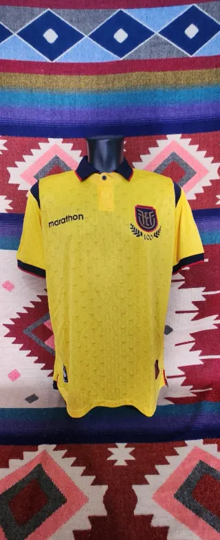 Camiseta de la Selección de Ecuador. - Diseño en color amarillo. - Cuello tipo polo con detalles en azul. - Logo de Marathon en el pecho. - Escudo de la selección conmemorativo.