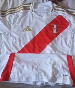 Camiseta de la selección de Perú. - Diseño con franja diagonal roja. - Detalles dorados en hombros y logo. - Escudo de la FPF bordado.