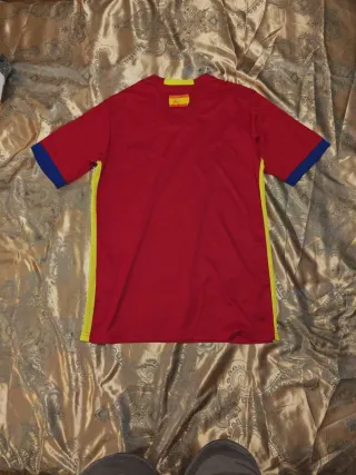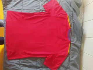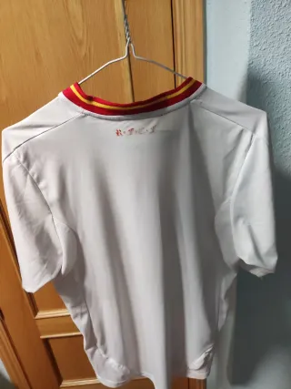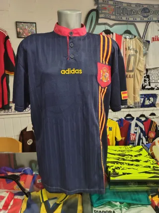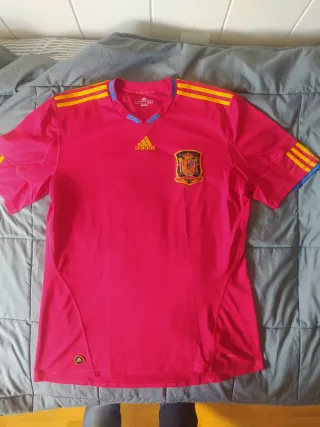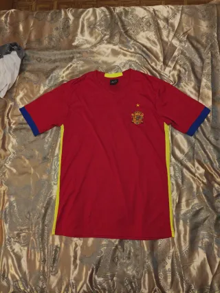 Preciosa camiseta de la selección española de fútbol. Talla L. Tan sólo usada una vez. - Diseño con los colores rojo y azul. - Logo de Adidas en amarillo. - Escudo de la selección española. - Detalles de las tres franjas en las mangas.