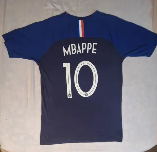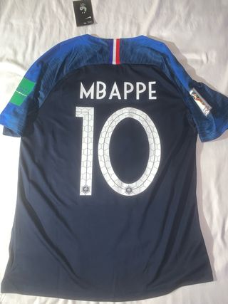 Camiseta de fútbol de Francia con el número 10 y el nombre Mbappe. - Diseño oficial de la selección francesa. - Parche de la FIFA World Cup Russia 2018 en la manga. - Logo de Nike bordado.