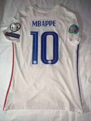 Camiseta de fútbol de la selección de Francia con el dorsal 10 de Mbappé. - Diseño blanco con detalles en azul y rojo. - Parche de respeto en la manga izquierda. - Parche de la Eurocopa en la manga derecha.