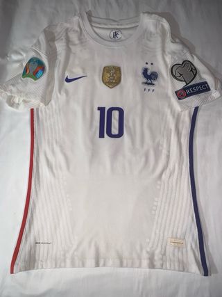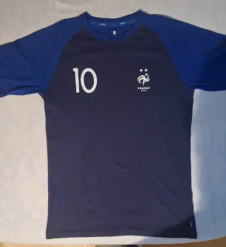 Camiseta de fútbol de la selección de Francia, con el número 10. - Diseño con el escudo de la FFF y dos estrellas. - Mangas de color azul contrastando con el cuerpo de la camiseta.