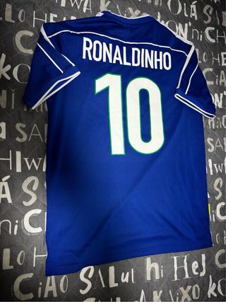 Camiseta vintage de fútbol de Brasil con el número 9 y el nombre de Ronaldo. - Diseño clásico en amarillo y verde. - Logo de la selección brasileña. - Parche de la Copa del Mundo.