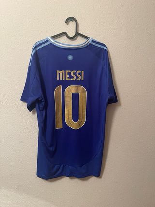 Camiseta de la selección Argentina con la 10 de Messi. - Talla XL - Escudo de la AFA y parche de la FIFA. - Detalles de rayas celestes y blancas en los costados.