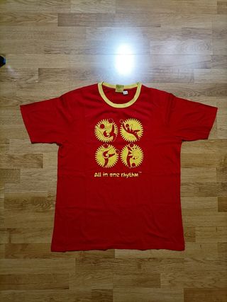 Camiseta de algodón roja de España con un diseño de "All in one rhythm". Sirve para llevar por casa, para salir un momento o para animar a la selección. Está en buen estado.