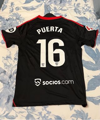 Camiseta 3ª equipación del Sevilla FC para la temporada 2025/26. -Personalizada con el Nº16 PUERTA - Diseño principal en color negro con detalles en rojo. - Logo de Adidas en rojo en el pecho. - Escudo del Sevilla FC en rojo en el pecho. - Inscripción Midea en blanco en el frontal. - Tecnología Aeroready en la parte inferior.
