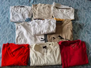 Conjunto de nueve camisetas de diferentes marcas y colores. - Camiseta blanca con estampado gráfico. - Camiseta beige lisa. - Camiseta blanca con detalle de franja amarilla. - Camiseta blanca con logo de Puma. - Camiseta beige con estampado de montaña. - Camiseta roja con cuello en V. - Camiseta blanca con logo de Superdry. - Camiseta roja jaspeada. - Camiseta blanca lisa.