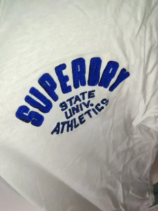 Camiseta Superdry original en color blanco, corte clásico y cuello en “V”. Talla XL (etiqueta interior). Diseño deportivo con bordado “Superdry State Univ. Athletics” en azul en el pecho.