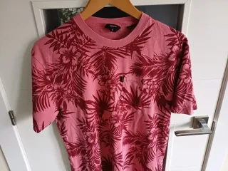 Camiseta de manga corta con estampado floral y hojas tropicales. - Diseño llamativo con flores rosas y hojas verdes. - Cuello redondo y manga corta. - Etiqueta de la marca visible en el cuello.