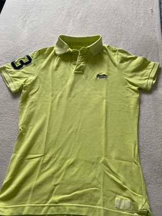 Polo de manga corta para chico con un llamativo color verde. - Cuello tipo polo con tapeta de botones. - Logo de la marca bordado en el pecho. - Poco uso, 5 o 6 veces, solo tiene un pequeño imperfecto en una manga como adjunto en foto pero apenas se nota. Color verde lima muy bonito, se vende porque la talla no va bien solamente.