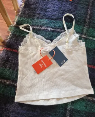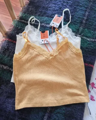 Dúo de camisetas de corte crop tops en blanco y color mostaza de Superdry ideales para looks Y2K, coquette y sutilmente sexi. Detalles que los hacen imprescindibles:Tela acanalada de algodón de alta calidad, súper suave, y elástica que se adapta al cuerpo sin apretar. Encaje delicado en los bordes: un toque femenino, romántico y vintage. Tirantes ajustables, finos y cómodos. Su favorecedor corte crop top resulta ideal con jeans high-waist, faldas, shorts o pantalones cargo. Aunque la camiseta mostaza es de talla S y blanca de talla M, ambas son exactamente iguales, tal y como demuestra la cuarta foto.